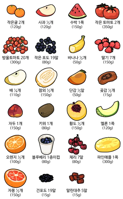 아래 과일의 1 교환 단위를 참고해 하루에 섭취하는 과일의 양을 비교해 보고 얼만큼 먹어야 할지 확인해 보세요.