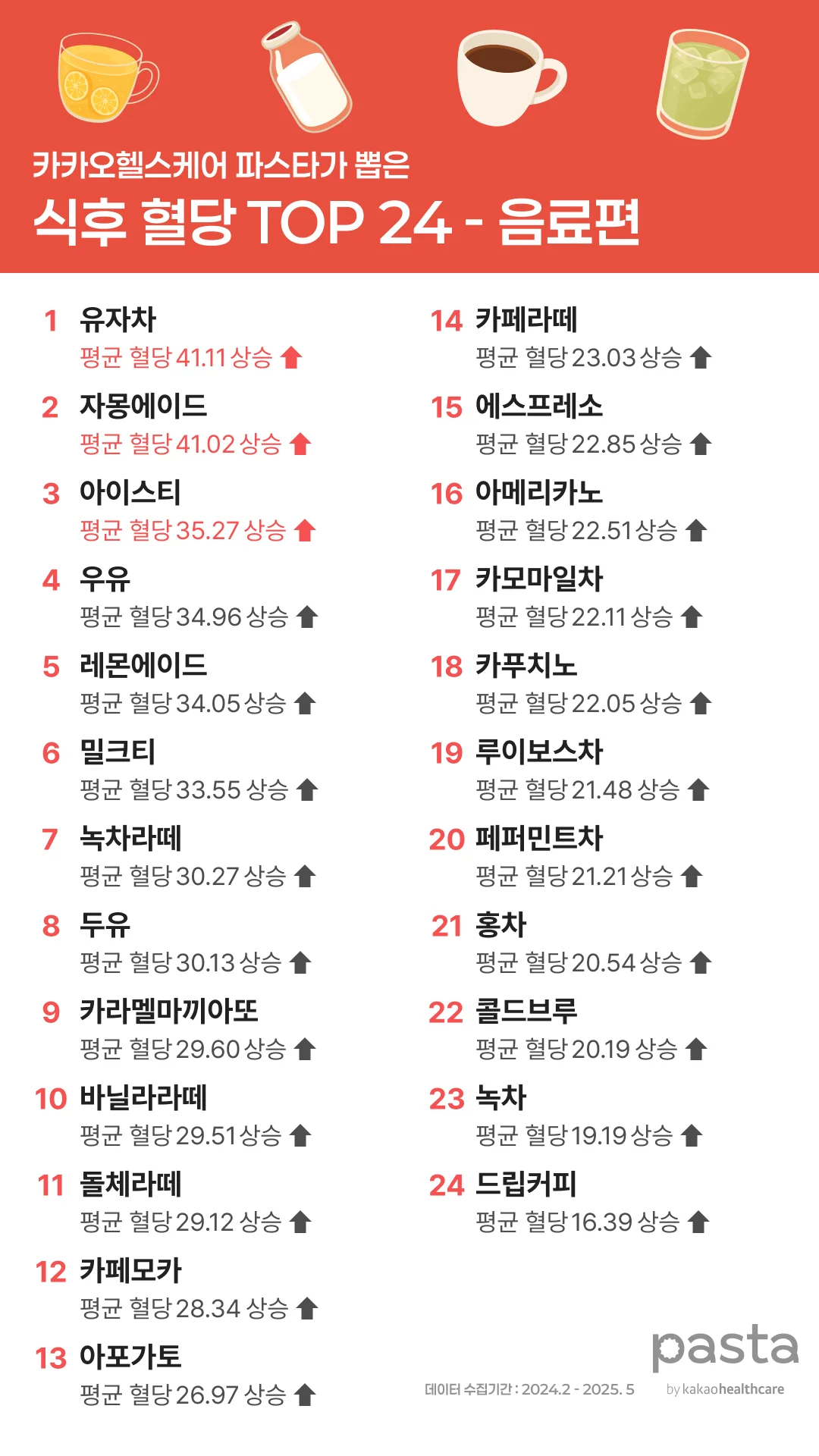 파스타 앱 사용자들이 2024년 2월부터 2025년 5월까지 직접 기록한 연속혈당측정기(CGM) 데이터를 바탕으로, 대표적인 카페 음료 24종의 식후 혈당 반응을 분석해봤습니다.