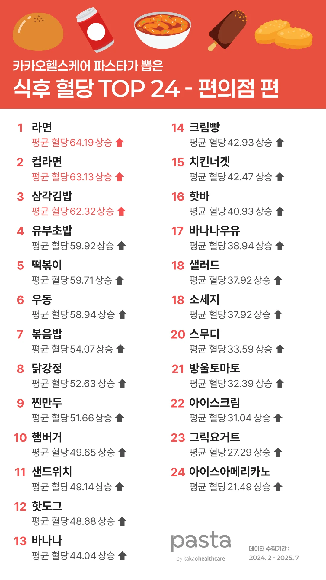 파스타 앱 사용자들이 2024년 2월부터 2025년 7월까지 직접 기록한 연속혈당측정기(CGM) 데이터를 바탕으로, 편의점에서 자주 섭취하는 음식 24종의 식후 혈당 반응을 분석해봤습니다.