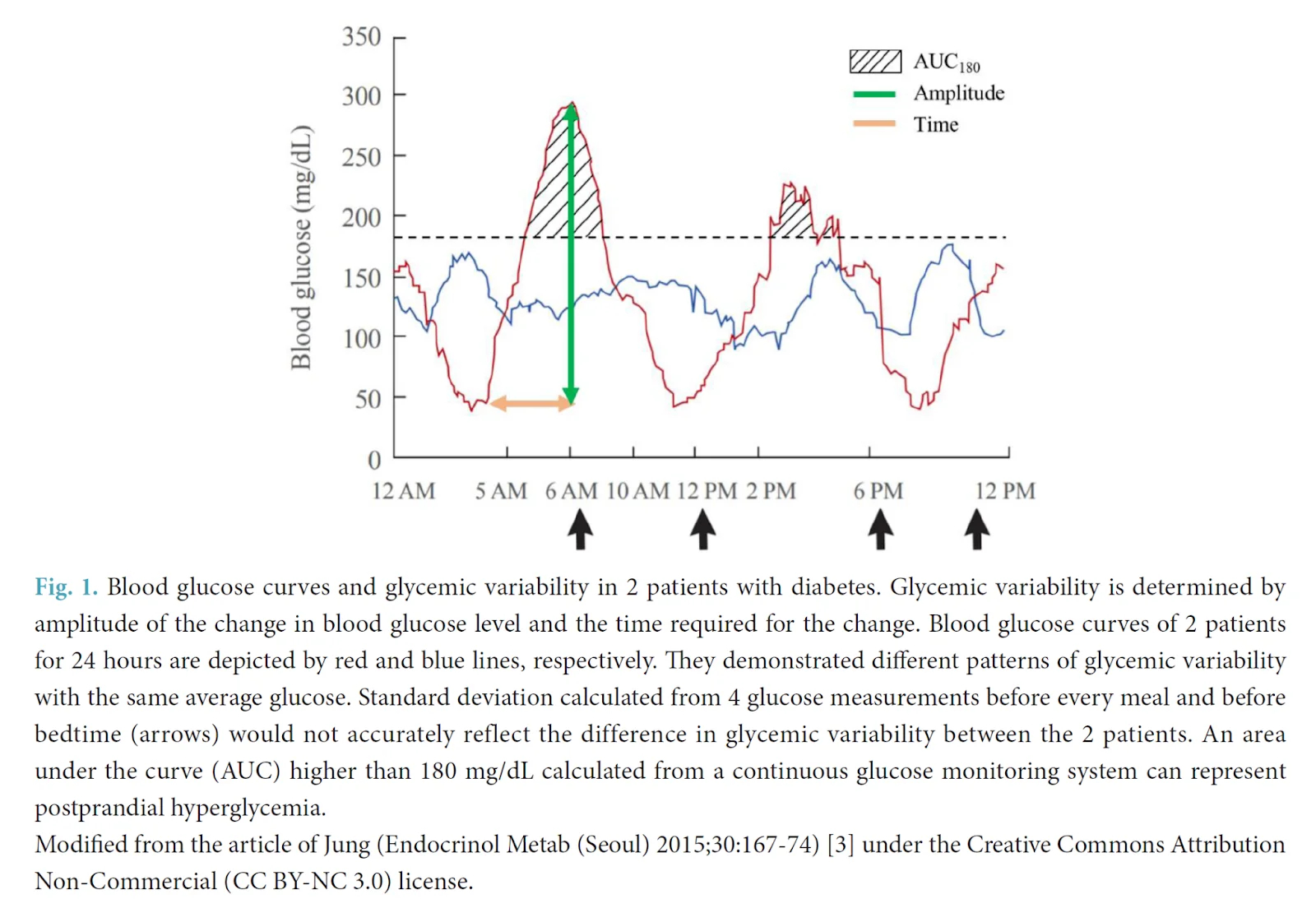 하지만 당뇨병 환자의 경우 식사 전 혈당이 110mg/dL이고 식사 후 2시간 뒤 180mg/dL가 되면 2시간 동안의 혈당 변화가 70mg/dL이기 때문에 혈당 변동성이 작은 건강한 사람에 비해 당뇨병 환자들은 혈당 변동성이 큰 경우가 더 많습니다.