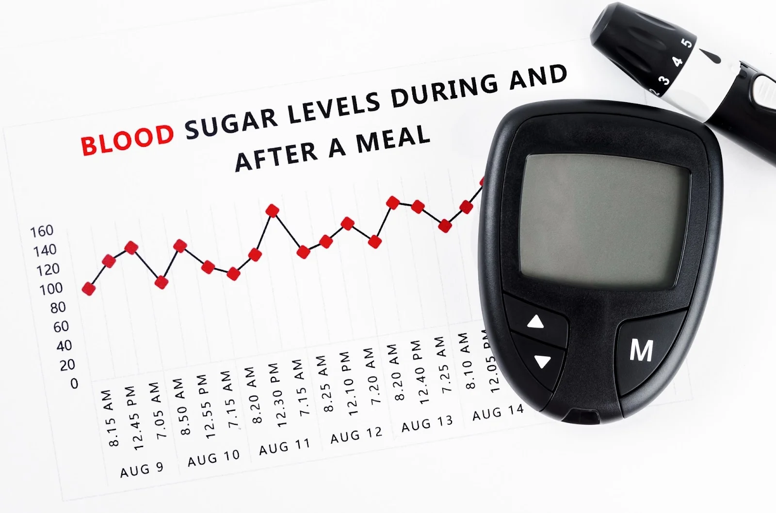 식사할 때 먹는 음식의 종류뿐만 아니라 먹는 순서, 식사 시간, 스트레스 여부에 따라 다양한 모양의 혈당 그래프가 나옵니다.